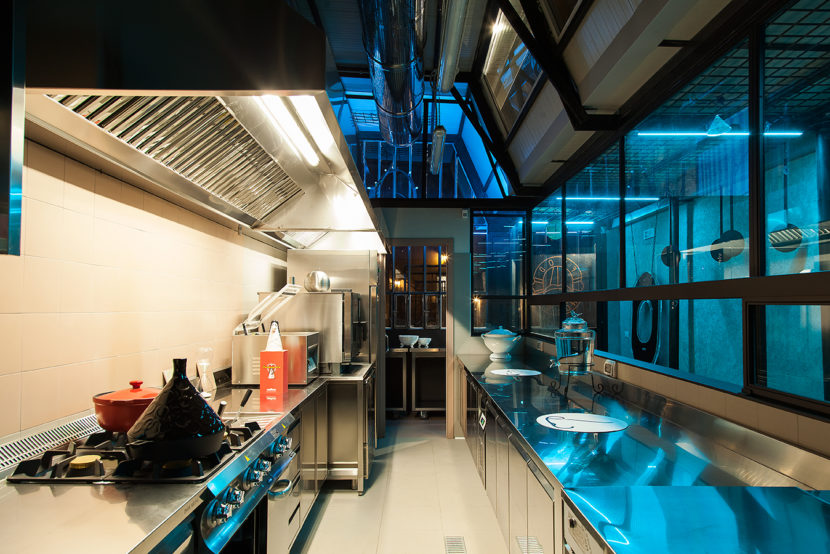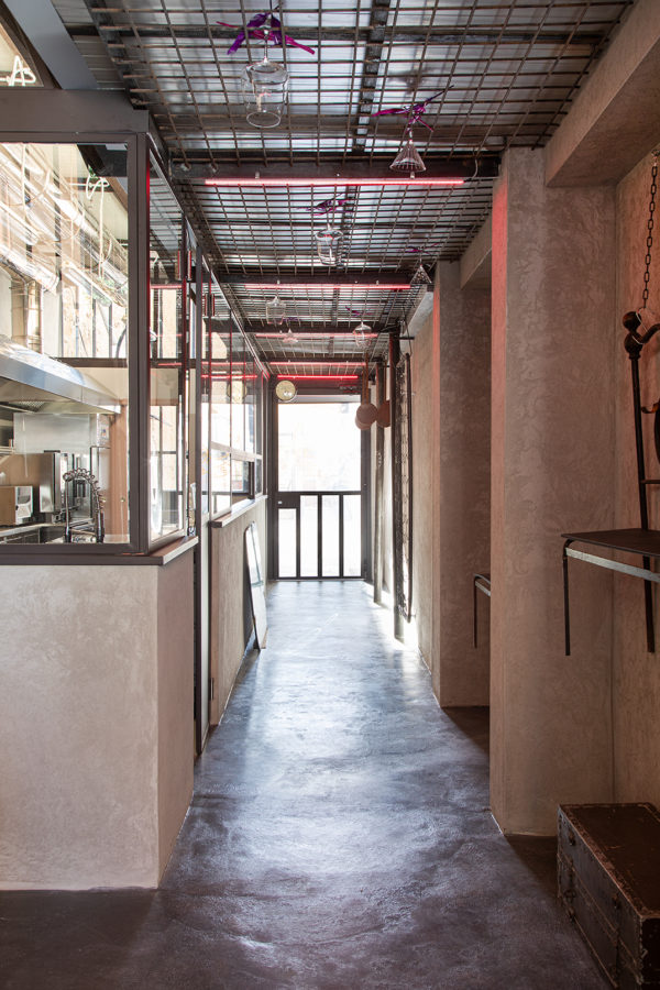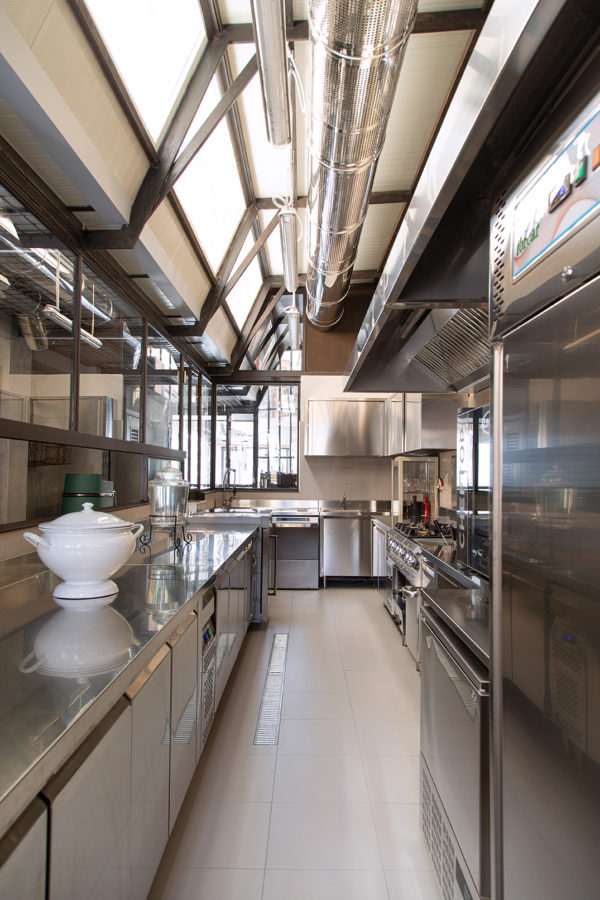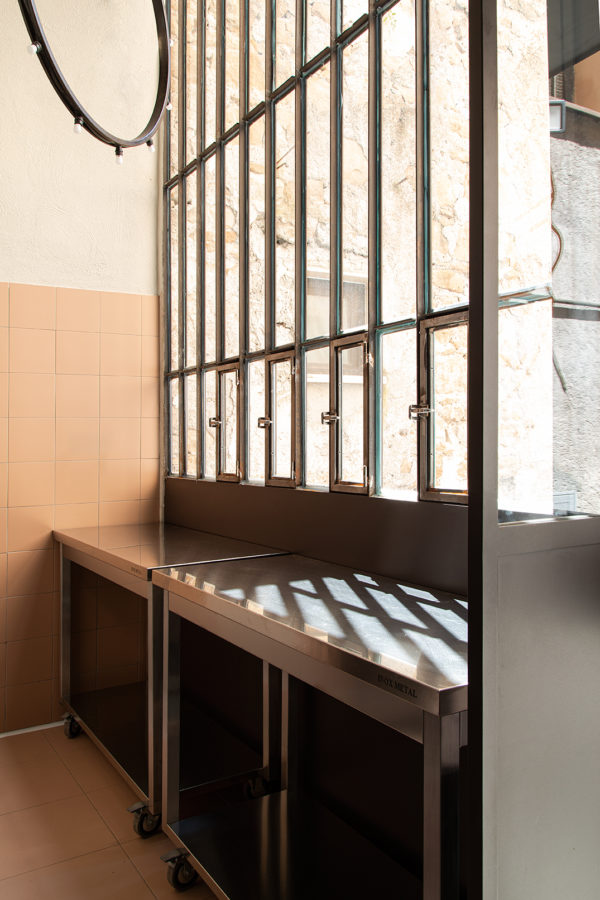 La struttura è un ex laboratorio di marmi. Sono state recuperare le vetrate originali di ingresso, accostandole con una nuova struttura in ferro e vetro che divide la cucina a vista con l’area per il pubblico, ricreando uno stile di gusto industriale.